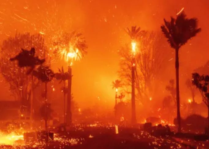 The scale of the catastrophe defies comprehension: streets, businesses, landmarks, schools, and the homes of a long list of people I love have been wiped away. Sunset Boulevard in Pacific Palisades—the community’s main street, where we cheered on the antics of the local Optimists Club during the Fourth of July Parade—now looks like Dresden after firebombing. The winds that whipped the blaze into an inferno have weakened today, but only a tiny fraction of the fire is contained.