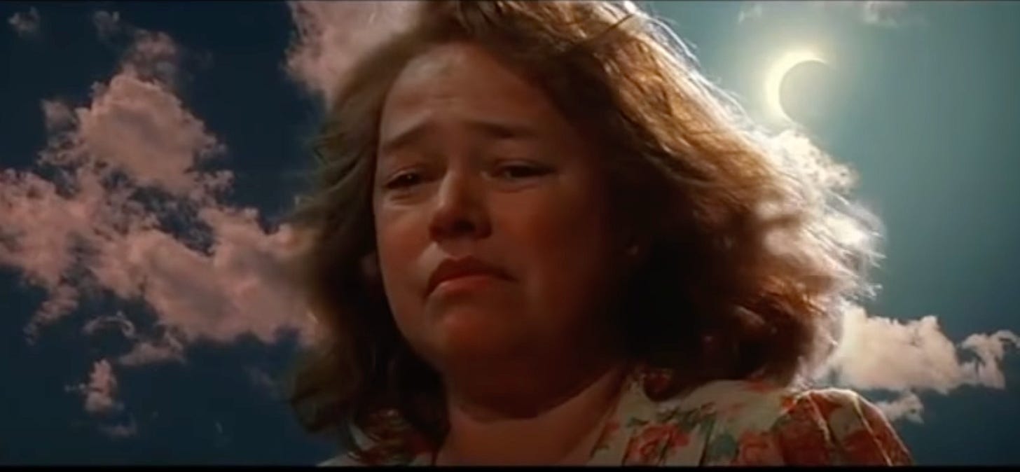 With apologies to our Druid high priest, we’re not typically moved by this sort of thing. Our favorite total eclipse appears in Stephen King’s novel Dolores Claiborne. In the 1995 movie version, Dolores (Kathy Bates) memorably finishes off her godawful husband Joe (David Strathairn) while every boob in New England looks up. The moon, a nifty accomplice, gives Dolores cover for justifiable homicide. In giving way to the sun, it also symbolizes her deliverance from horror.